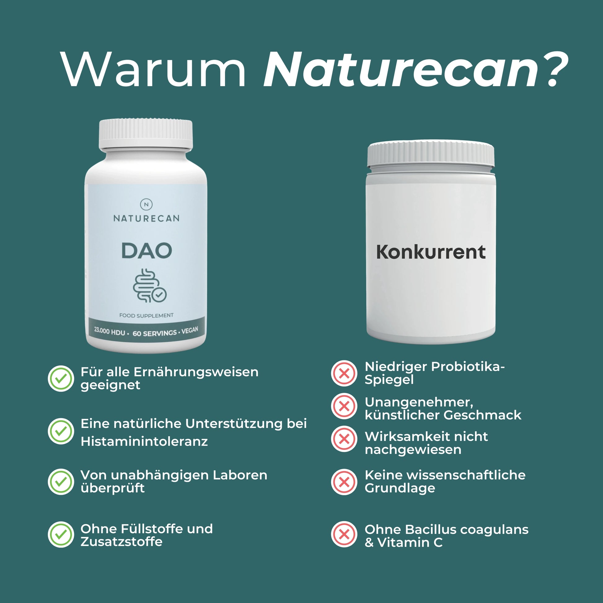 DAO kommt zwar in manchen Lebensmitteln vor, jedoch nicht in wirksamer Menge. Mit den hochdosierten Kapseln von Naturecan erhältst du eine zuverlässige und einfache Unterstützung – Tag für Tag.