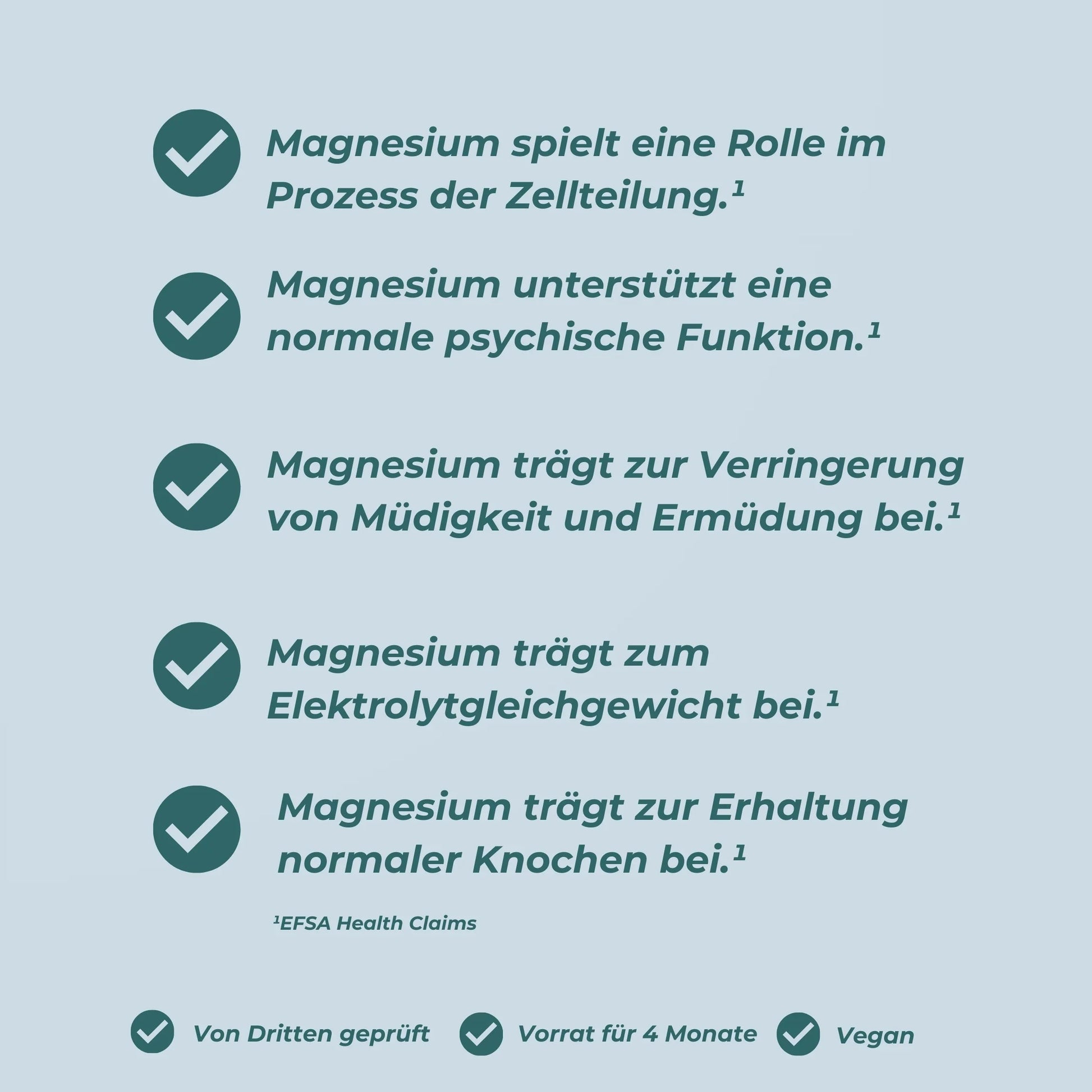 - Enthält Magnesium in drei Formen: Bisglycinat, Citrat und Lactat